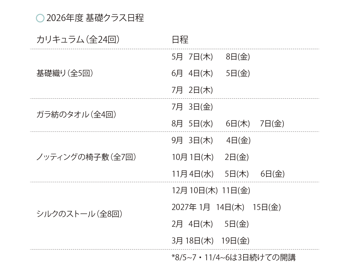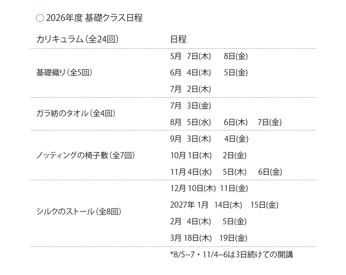 これから織りを始めたい方が月1回、主に木・金曜で集中して学べるコースです。